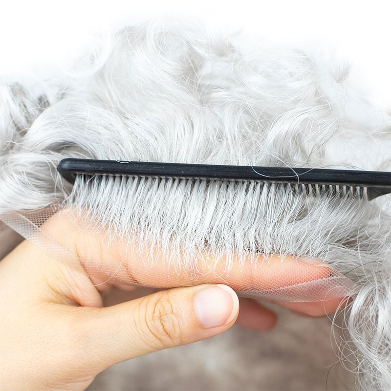 The men's hair toupee is Eminent Hair custom men's hair Toupee. The production time is around 6-7 weeks and rush for 4 weeks. The base design is fine mono with clear PU edge. The material is durable, delicate and breathable. Factory Direct Grey Hair Toupee can bear large density and the lift span is around 9-12 months if treated well. The skin edge can use tape or glue easily.