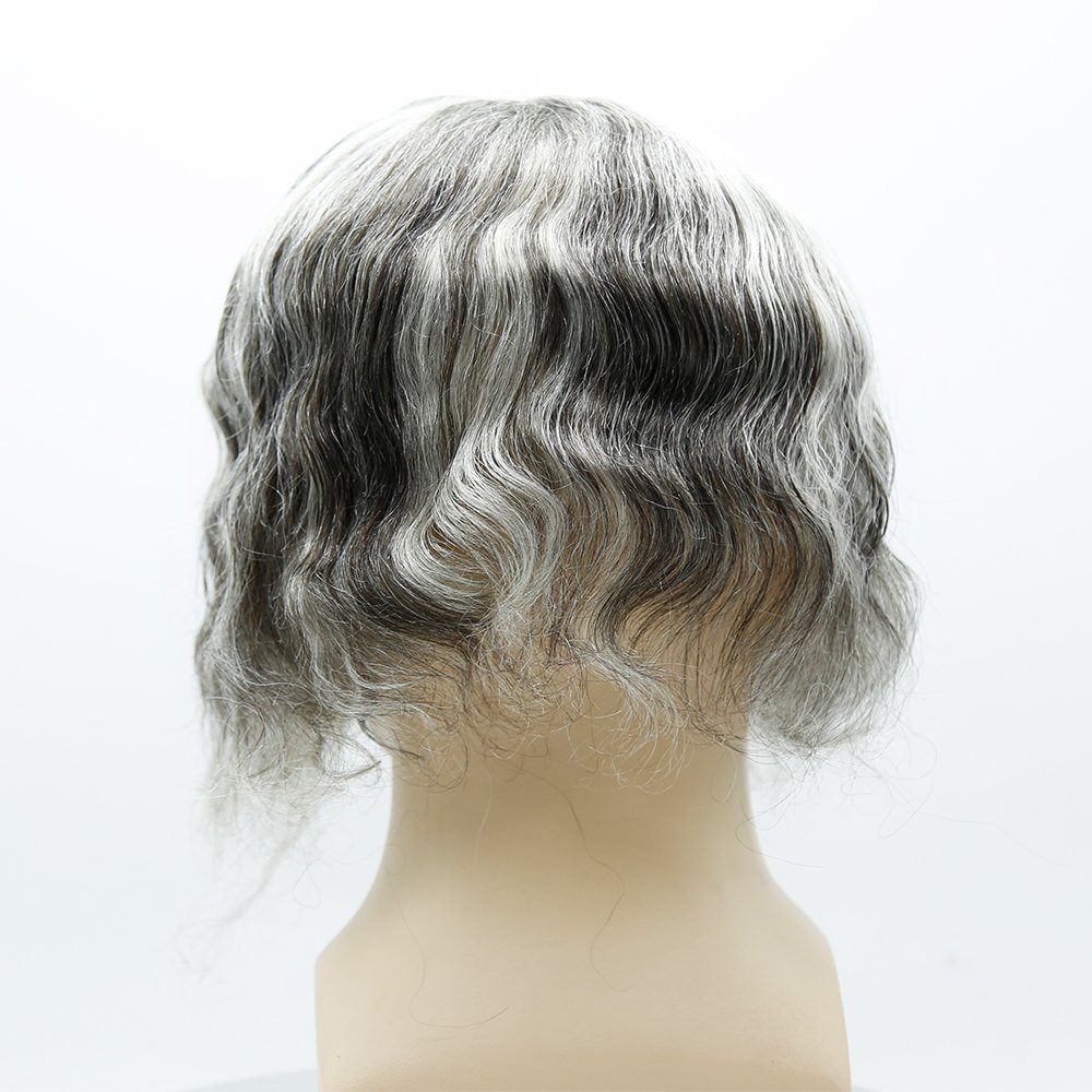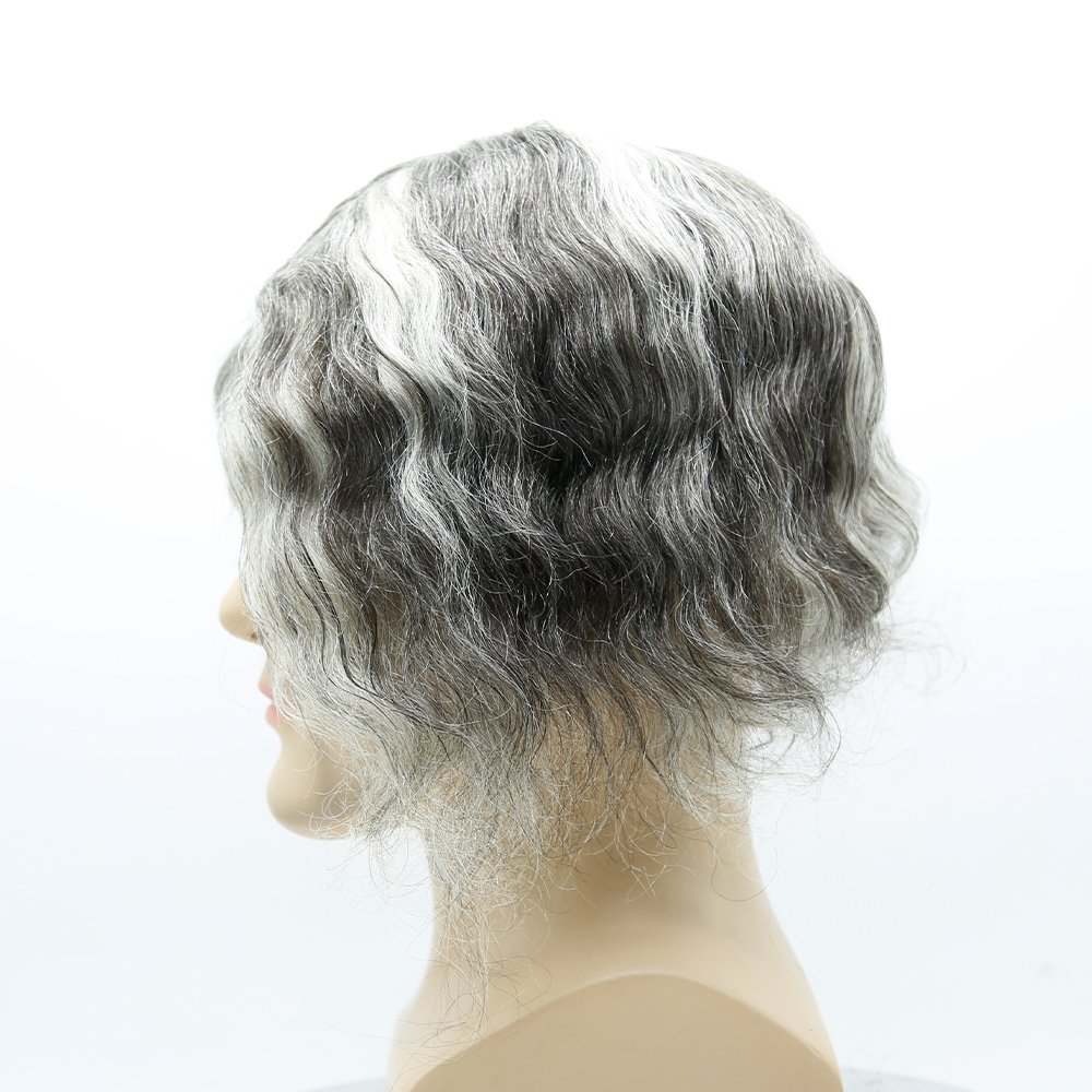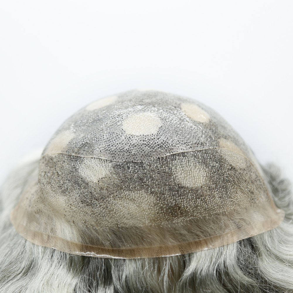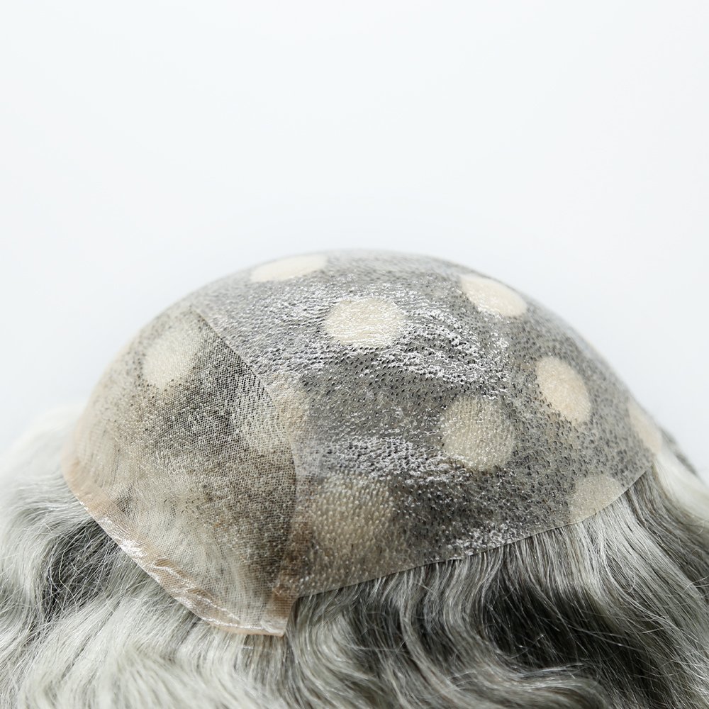 The lace front wig is Eminent Hair custom made men wig. The base type is lace front with skin. Lace front make a natural hairline and it is breathable. The highlight is 1inch*1inche grey round. The production time is around 8 weeks and in rush for 4-6 weeks.
