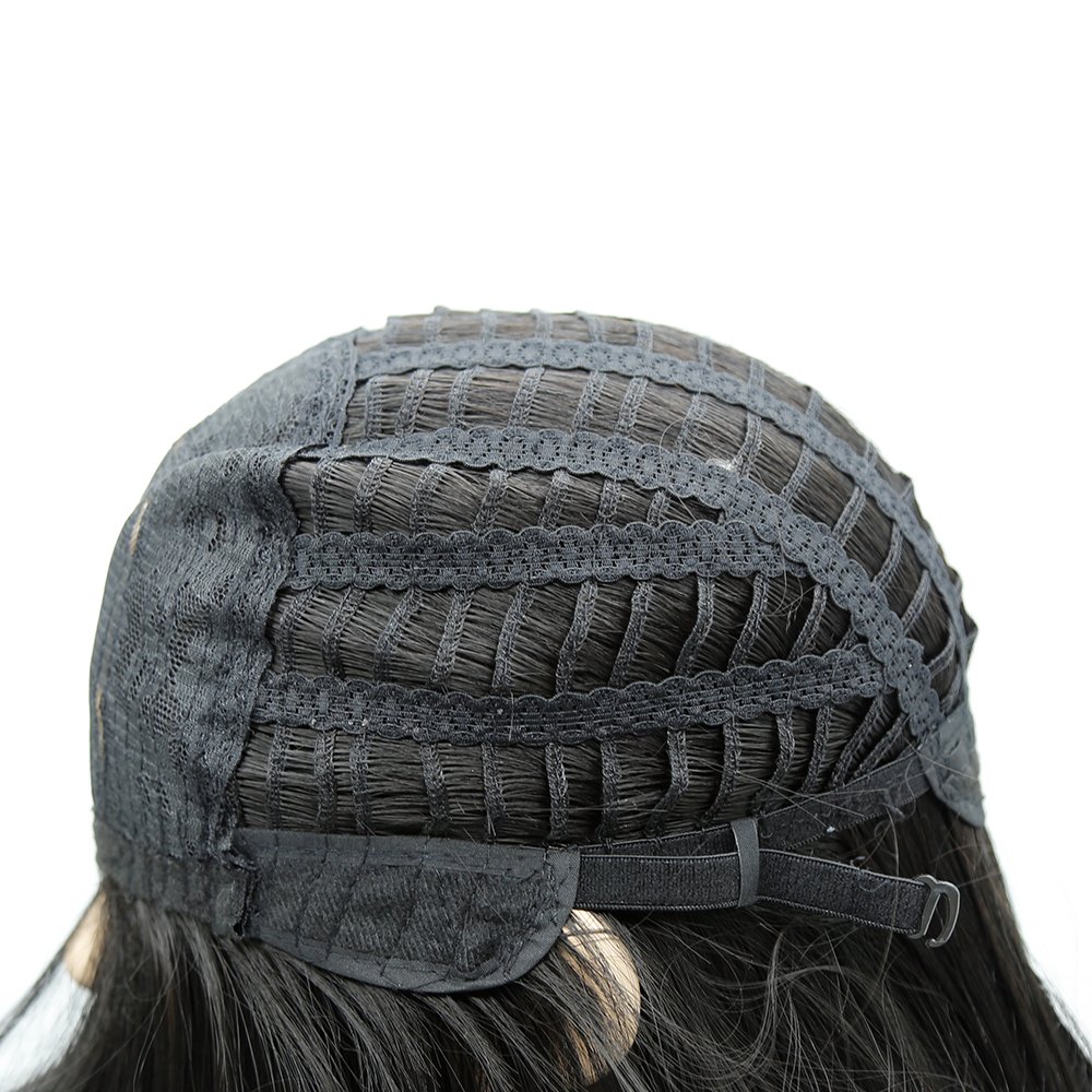 This is our synthetic wig. Hair length is shoulder-length with fringe. It has silk top, which is very natural. You can’t see the knots from the top. We put weft and S-shaped hook on the back. Then customers could adjust the size they want. The lifespan is about 6 monthes.